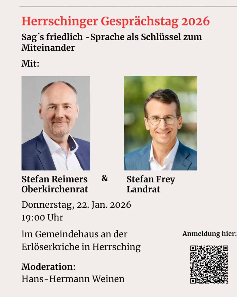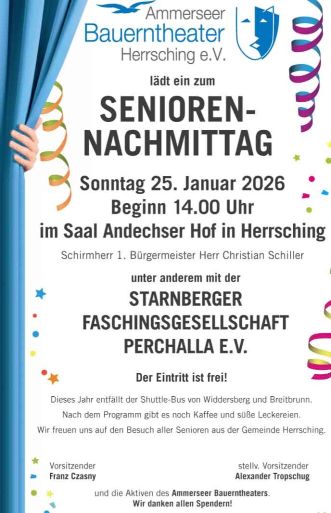 Der Bauausschuss befasst sich am Montag, 19. Januar, 19 Uhr, mit dem Vorbescheid für die Errichtung von zwei Doppelhaushälften in der Ploetzstraße 6. Weiteres Thema: Die Klosterwiese in Breitbrunn. Die Gemeinde plant, hier den Bauturbo unter Umgehung des geplanten Bebauungsplans zu zünden. Der Wahlausschuss für die Gemeindewahl tritt am 20. Januar ab 17 Uhr im Rathaussaal zusammen. Die Sitzung ist öffentlich. Herrschinger Gespräche am 22. Januar im evangelischen Gemeindehaus mit Landrat Stefan Frey und Oberkirchenrat Stefan Reimers. Thema: Sag’s friedlich. Beginn ist um 19 Uhr. Seniorentag des Ammerseer Bauerntheaters Herrsching: Am Sonntag, 25. Januar, lädt ab 14 Uhr das Ammerseer Bauerntheater Seniorinnen und Senioren aus Herrsching und Widdersberg zu seinem traditionellen Seniorennachmittag ein. Ort: Andechser Hof. Die Starnberger Faschingsgesellschaft Perchalla bietet zusammen mit Mitgliedern des Bauerntheaters ein buntes Unterhaltungsprogramm. Der Eintritt ist frei. Aufführung der Theaterzwerge des Ammerseer Bauerntheaters: „Die Träne der Elfe“ heißt der Titel des neuen Stücks, das die Theaterzwerge des Ammerseer Bauerntheaters an zwei Wochenenden Ende Januar und Anfang Fabruar zur Aufführung bringen. Jeweils samstags und sonntags, am 31. Januar, 01. Februar und am 07./08. Februar stehen die 18 jungen Schauspielerinnen und Schauspieler auf der Bühne im Saal des Arthotels / Andechser Hof. Die Vorführungen dieses Märchenspiels in vier Szenen beginnen jeweils um 16:00, der Eintritt bei freier Platzwahl beträgt 7€. Karten gibt wie immer bei der Touristinformation, oder online unter: ammerseer-theaterverein.de/karten-vorverkauf!