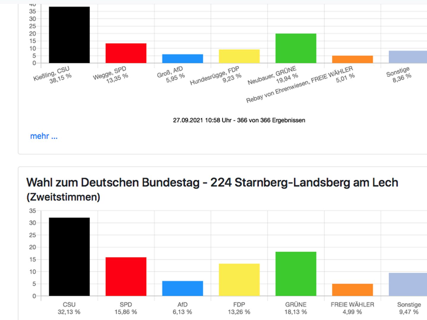 Der CSU-Bundestagskandidat Michael Kießling hat den Wahlkreis Starnberg-Landsberg-Germering mit 38.2 Prozent der Erststimmen für sich entschieden. Kießling verlor 3,9 Prozent gegenüber der Wahl von 2017. Mit starken 19,9 Prozent und einem Stimmenplus von 8,0 Prozent kam die Grüne Martina Neubauer auf Platz 2.
