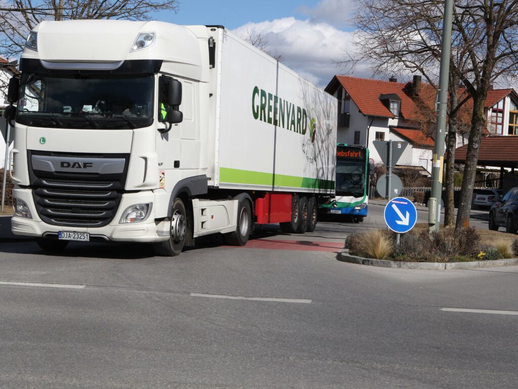 • Wenn ein Lkw oder ein Bus in die Rieder Straße einbiegen will, ist auch die Abbbiegespur blockiert