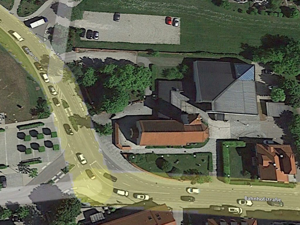 Auf der Rieder und dem oberen Teil der Bahnhofstraße sind Fahrrad-Schutzstreifen aufgemalt. Hier wird’s auch wegen der Abbiegespur so eng, dass ein breiter Bus kaum eine Chance hat, den Schutzstreifen nicht zu tangieren. Radfahrer sind gesetzlich nicht verpflichtet, diesen Schutzstreifen zu benutzen