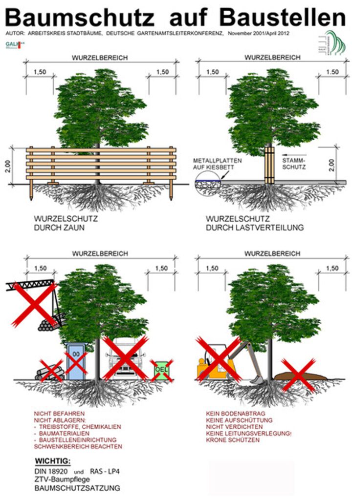 Nach den Richtlinien der Deutschen Gartenamtsleiterkonferenz sollten Bäume im Wurzelbereich nicht mit schwerem Gerät befahren wurden. Diese Schutzzone umfasst den Durchmesser der Baumkrone plus einen Sicherheitsabstand von 1,5 Metern. Christiane Gruber vermutete in der letzten Sitzung, dass die zwei südlichen Häuser den geschützten Stieleichen viel zu nah kommen.