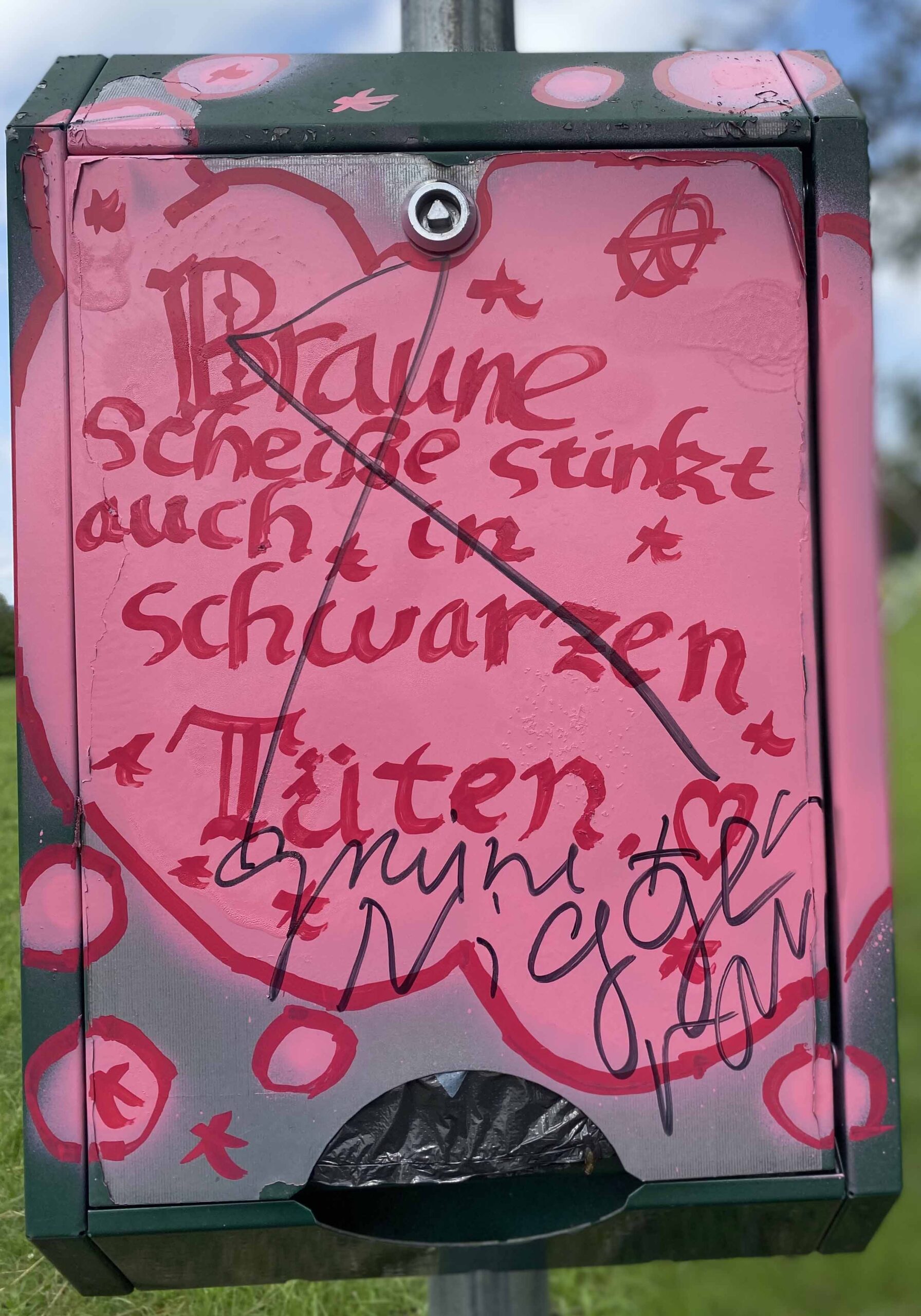 Jetzt toben sie sich auch noch analog aus: Auf einem Hundebeutelbehälter am Königsberg hatte ein Freiluft-Faschist einen Nazispruch hinterlassen, dessen Inhalt hier nicht wiedergegeben werden soll. Darauf hin übermalte eine Gruppe junger Leute unbekannter Herkunft den braunen Bullshit mit einem kräftigen Aphorismus, der mit dem Inhalt der schwarzen Tüten spielt. Kleine Anregung für das Zeugnis der jungen Staatsbürgerinnen und -bürger: Deutsch, Geschichte und Kalligrafie auf jeden Fall „Sehr gut“.