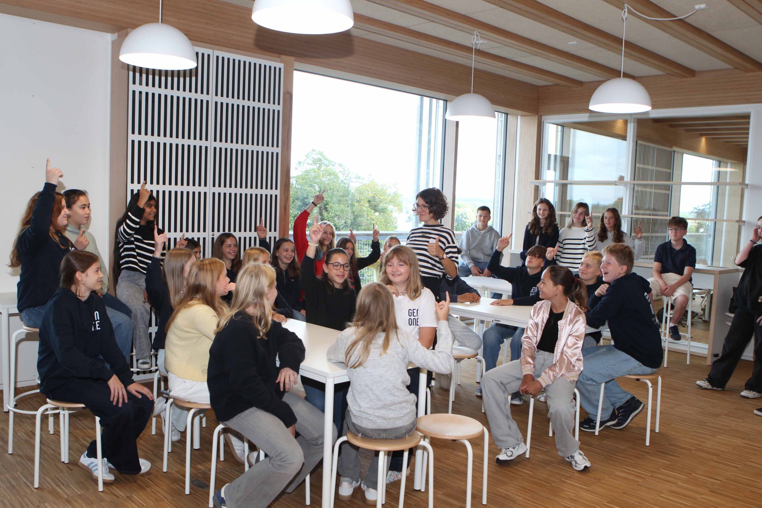 Erster Tag, erste Stunde für die Schülerinnen und Schüler der neuen 7d. Die Lehrerin Julia Bolesch beschnuppert mit ihren Schützlingen das erste Mal die sogenannte Lernlandschaft des Herrschinger Gymnasiums. Wenn wir richtig gezählt haben, hat die Klasse 7d 30 Schülerinnen und Schüler. Foto: Gerd Kloos