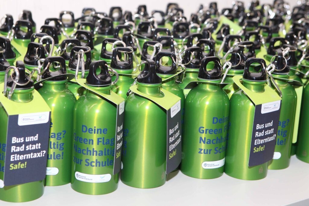Kampf dem Elterntaxi: Die Geschenk-Trinkflaschen werben für den Schulweg mit Bus und Rad.
