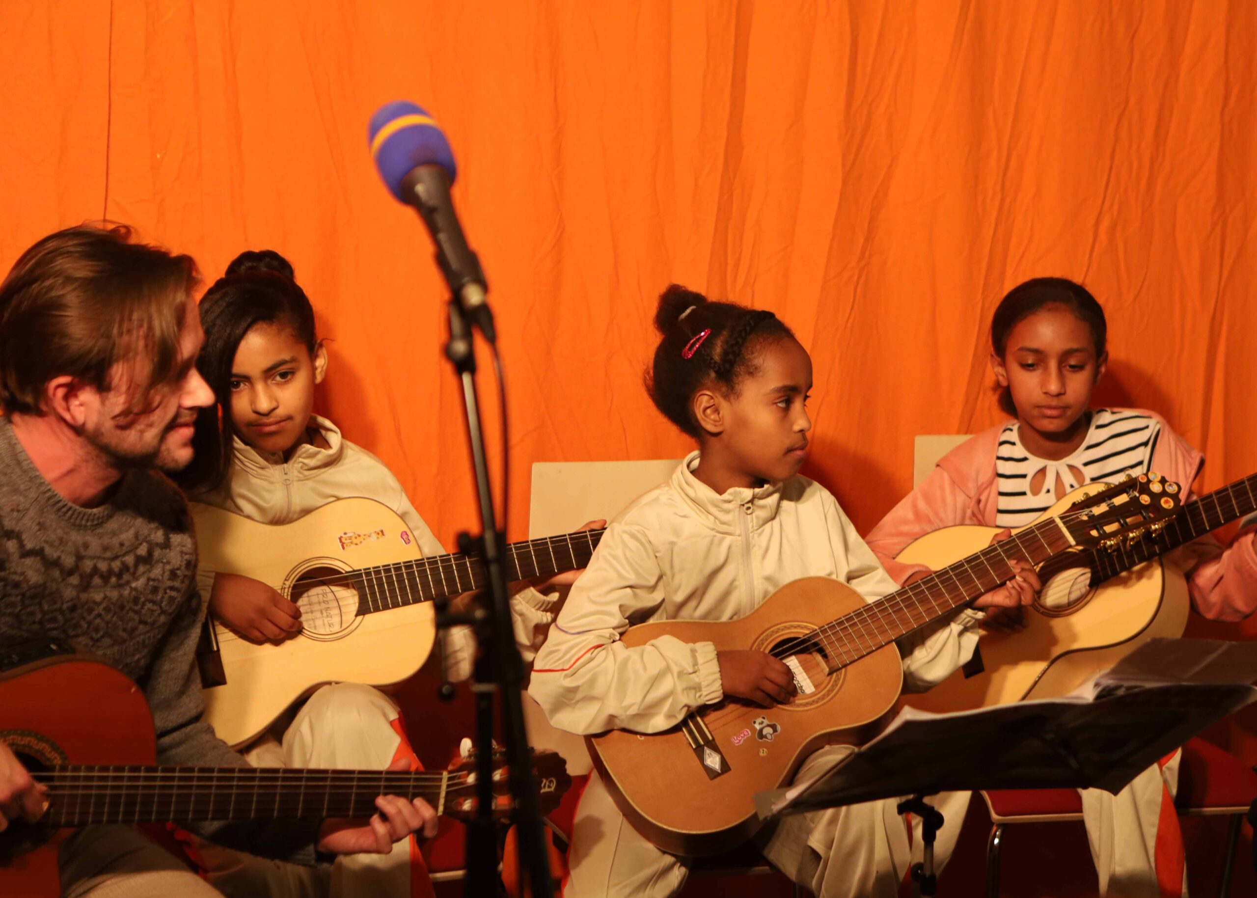 Solche düsteren Zustandsbeschreibungen allerdings waren kein Thema fürs Jubel-Fest – schließlich sollten zehn Jahre harte Arbeit gefeiert werden. Zum Beispiel mit dem Musiklehrer Johannes Bauer, der die Kinder aus den Flüchtlingsfamilien ins Gitarrenspiel einweiht. Mit einigen seiner Schülerinnen und Schülern gab er eine kleine Kostprobe.