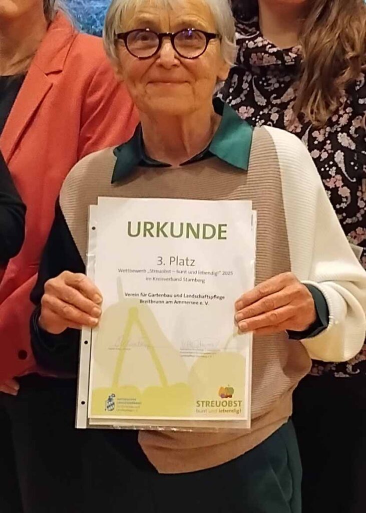 Ein weiteres Thema waren die Streuobstwiesen, inzwischen auch ein Lieblingsthema der Politik. Der Breitbrunner Gartenbauverein hatte am Heimgarten eine Wiese in eine Streuobstoase verwandelt und heimste so den dritten Preis in Landkreis ein. Heidi Körner äußerte nun die Hoffnung, dass man im Landkreisranking mit der neuen Streuobstwiese weiter nach vorne komme, schließlich ist der Gemeindebauhof Herrsching Partner für die Pflege der 14 Hochstämme.