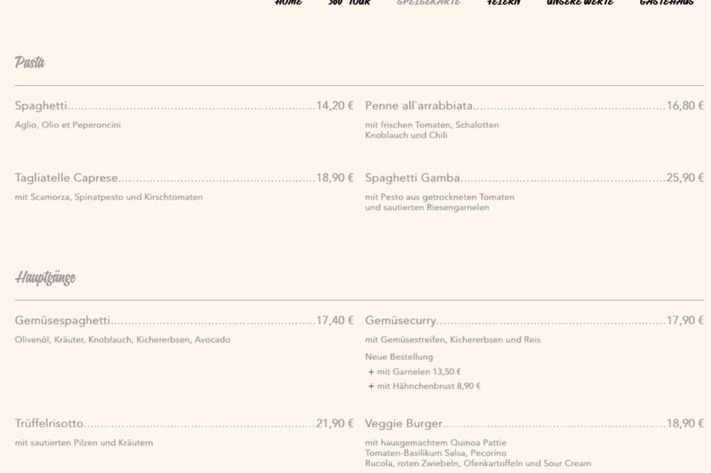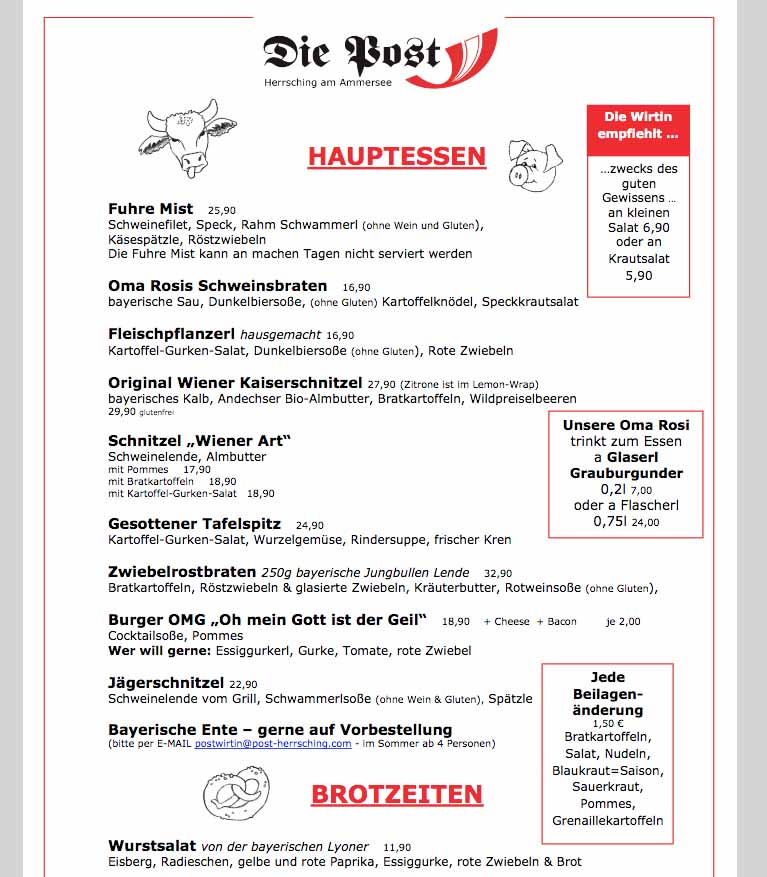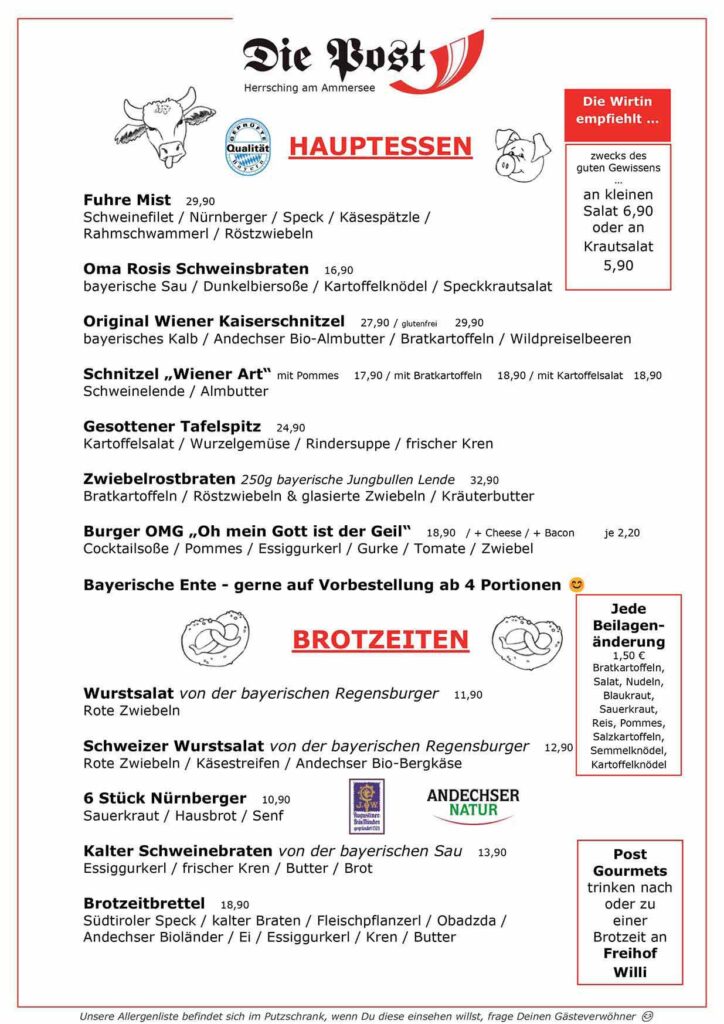 In früheren Zeiten war der Restaurantgast froh, wenn sich die Preise auf der Speisekarte nicht geändert haben. Nach dem 1. Januar 2026 ist der Gast traurig, weil sich die Preise nicht geändert haben. Dass die Gastronomie jetzt nur noch sieben statt 19 Prozent Steuern auf Speisenumsätze zahlen muss, ging an den Speisekarten spurlos vorbei. herrsching.online hatte die Speisekarten der Herrschinger Restaurants vor und nach dem 1. Januar 2026 fotografiert und verglichen – die Steuerermäßigung haben sich die meisten Wirte ohne Kommentierung einverleibt. Nur die Postwirtin Elisabeth Hellmann, 54, bietet den „lieben Gästen“ zwischen Januar und April ein paar Schmankerl an, die man sich öfter leisten kann. Trotzdem haben wir die Wirtin gefragt, warum die Gäste von Steuergeschenken nicht dauerhaft profitieren.