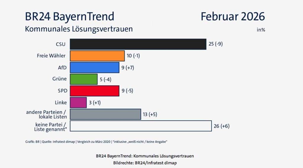 26. Februar: Der Bayerische Rundfunk hat in einer großen Umfrage das „kommunale Lösungsvertrauen“ in die einzelnen Parteien abgefragt. Der CSU trauen 25 Prozent der Bayern am ehesten zu, die wichtigsten Probleme vor Ort zu lösen. Damit liegen die Christsozialen in dieser Frage deutlich vor allen anderen Parteien, büßen aber neun Prozentpunkte ein. Den Freien Wählern bescheinigen zehn Prozent die größte kommunalpolitische Kompetenz (-1). Der SPD trauen neun Prozent Lösungen vor Ort zu (-5 Punkte), den Grünen fünf Prozent (-4). Deutlich besser als 2020 steht die AfD da: Ihr bescheinigen neun Prozent Lösungskompetenz, ein Plus von sieben Prozentpunkten. Die Linke liegt bei drei Prozent (+1). FDP, ÖDP und Volt kommen jeweils auf ein Prozent. Anderen Parteien sowie lokalen Wählervereinigungen und Bündnissen trauen zehn Prozent der Bayern zu, Probleme in den Griff zu bekommen (Quelle: BR24).