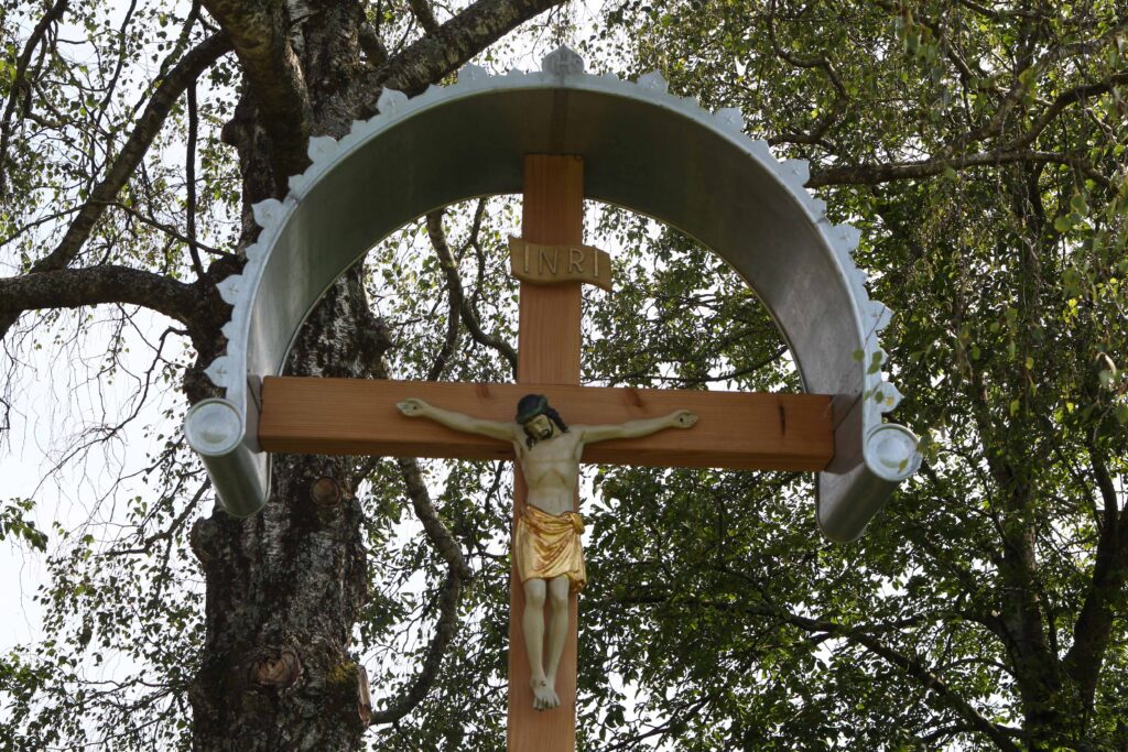 Kauf sich also der Hainzensepp ein großes Feldherrle und läßt sich vom Zimmermann ein großes Kreuz dazu machen. „Das Kreuz, das machen wir acht Schuh hoch“, sagt der Zimmermann, „und das Dach über dem Kreuz – das will ich mit Blech beschlagen wegen dem groben Wetter.“