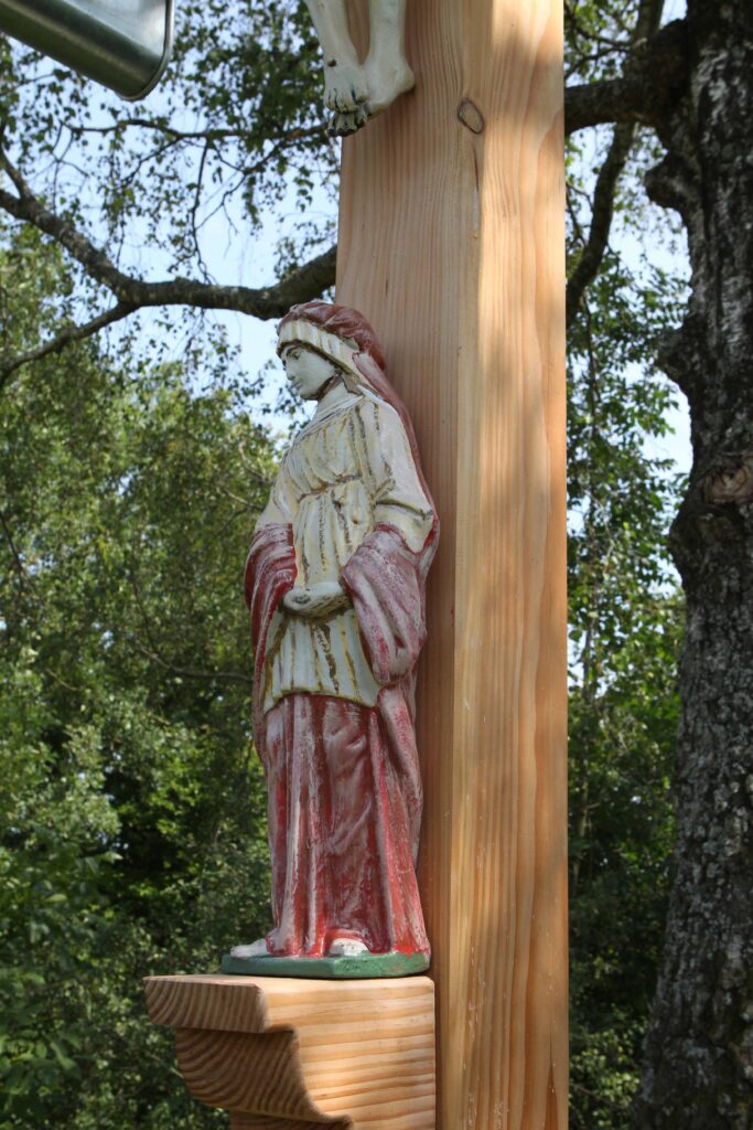 Der Abbau des Kreuzes war nun wohl eine Art von Protestakt. Im Lauf der Jahrzehnte geriet die Angelegenheit aber immer mehr in Vergessenheit, Bittgänge zu Feldkreuzen fanden ja seit langem nicht mehr statt. Mehrfach stieß der Schreiber dieser Zeilen bei Spaziergängen oben auf dem Kreuzberg auf etwas jüngere Einheimische, die verständlicherweise nichts mehr mit der Flurbezeichnung „Kreuzberg“ anfangen konnten. Und dass dort jemals ein Flurkreuz gestanden ist, davon wussten sie auch nichts. Der Schreiber fand das bedauerlich und machte sich auf die Suche nach dem verschwundenen Kruzifix, Es stellte sich dann heraus, dass es sich auf dem Heuboden des Bauernanwesens befand, dem es gehörte. Gefunden wurden noch ein Christuskorpus und eine Muttergottes-Statue, beide restaurierungsbedürftig. Der Rost hatte dem Gusseisen schon deutlich zugesetzt. Das Material ließ darauf schließen, dass die Figuren noch keine 150 Jahre alt waren.