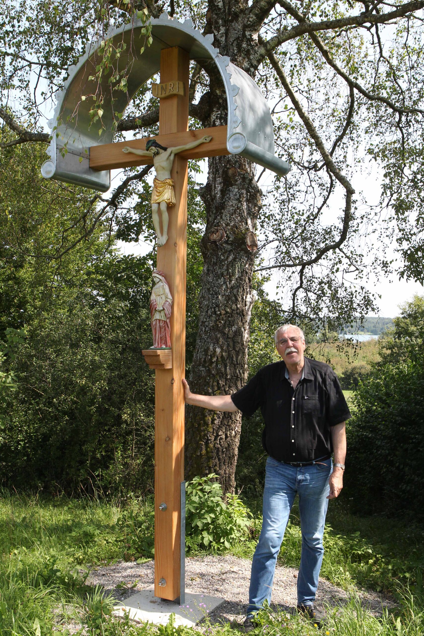 Er selbst würde es sicher ned öffentlich sagen, drum sag ich es, weil man das scho sagen sollte: Zimmerermeister Andreas Drexl hat seine Arbeiten auch kostenlos gemacht und gesagt, dass ihm dies „eine Ehre“ sei. Verwendet wurde übrigens Holz der Douglasie (und die hält länger als unsere heimischen Fichten). Das war nicht das erste Mal, dass er auf diesem Gebiet tätig war, das Familienfeldkreuz an der Straße nach Breitbrunn hat er auch gemacht.