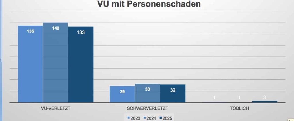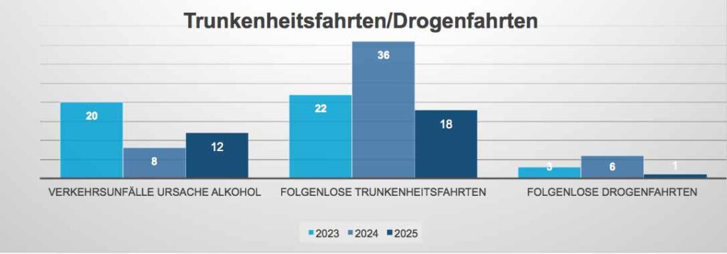 Eine andere Art von „Sucht“ ist im Verkehr schon leichter nachzuweisen: Der Alkoholkonsum spielt auch in Herrsching und Umgebung eine Rolle. Bei zwölf Unfällen war Alkohol im Spiel (Vorjahr: acht). Und nun die gute Nachricht: 2025 wurden nur 18 Fahrer bei Alkoholkontrollen erwischt – genau halb soviel wie im Vorjahr. Ob das nun an der wachsenden Vernunft der Autofahrer oder aber an der geringeren Zahl der Kontrollen liegt, geht aus der Statistik nicht hervor.